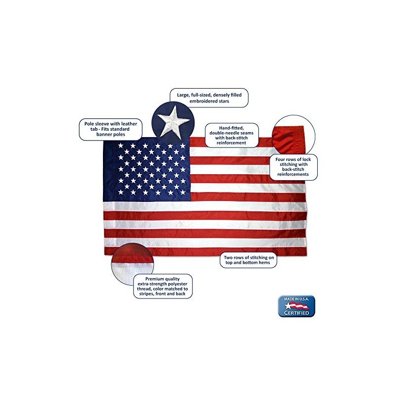 - Expert Craftsmanship! SEWN stripes use double-needle LOCKSTITCH with 4 ROWS on the Fly Hem and Back Tack reinforcement. Vivid WHITE STARS are densely EMBROIDERED. Tough OUTDOOR US Flag. DURABLE construction. Banner-style flag- pole sleeve leather tabs.