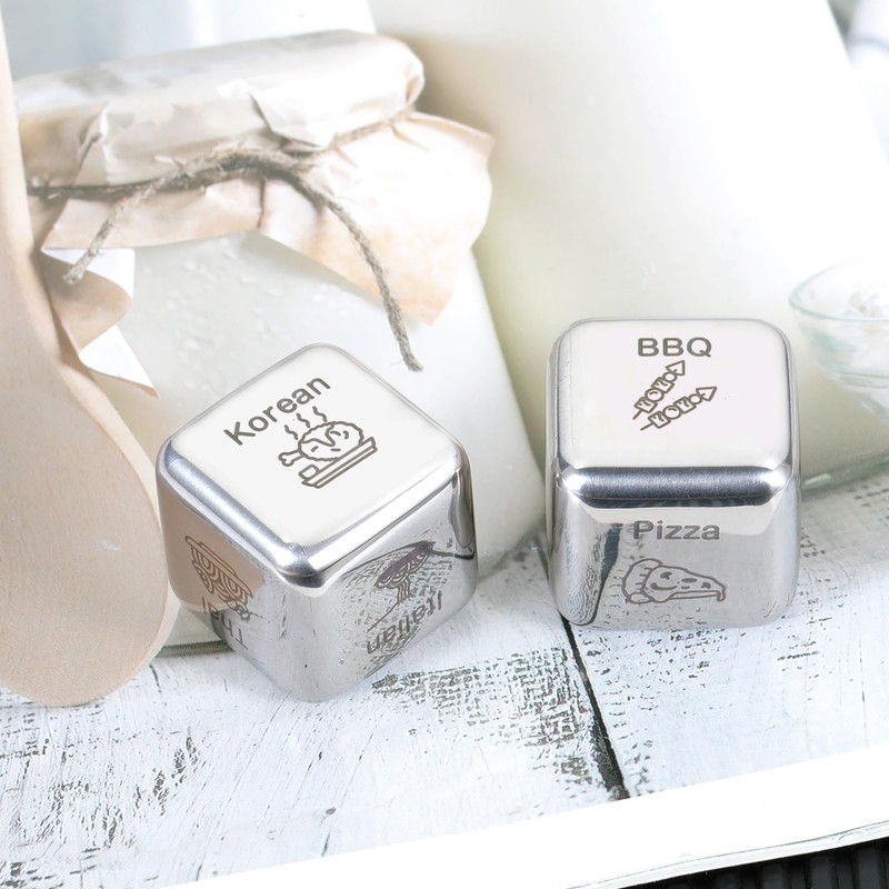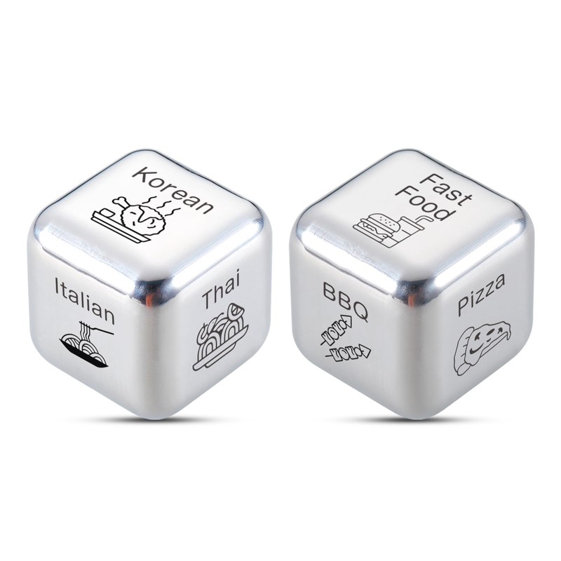 - 【Boyfriend Husband Gifts】Funny birthday gifts for women men, funny gifts for women men, birthday gifts for boyfriend girlfriend, husband gifts from wife, birthday gifts for husband wife, husband Christmas gifts, stocking stuffers for women men, stocking stuffers for adults, house warming gifts new home couple, date night ideas for couple, food dice, food decision dice. It made of stainless steel, engraved lettering is clear and easily to read. Size is 25MM*25MM, ready for gift giving.