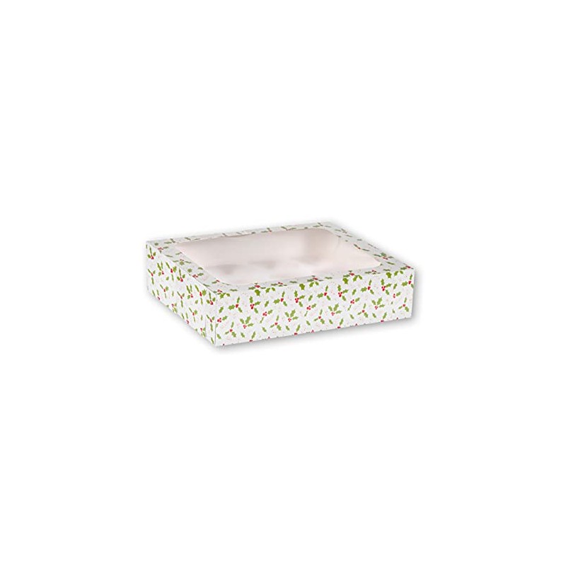 Anniversary House Christmas Cupcake Box with Window and Removable 12 Hole Insert, Holly Print, Easy Assembly, 7.5 x 25 x 31 CM, J113