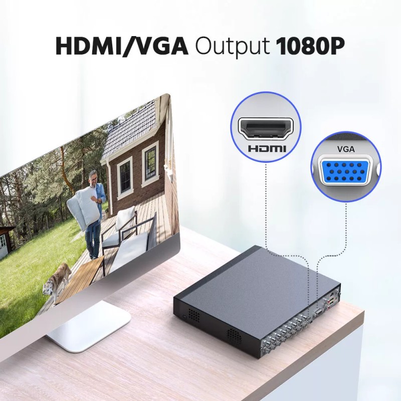 This DVR supports HDMI/VGA outputs with up to 1080P clarity, assuring you have a good vision experience and never miss any details.