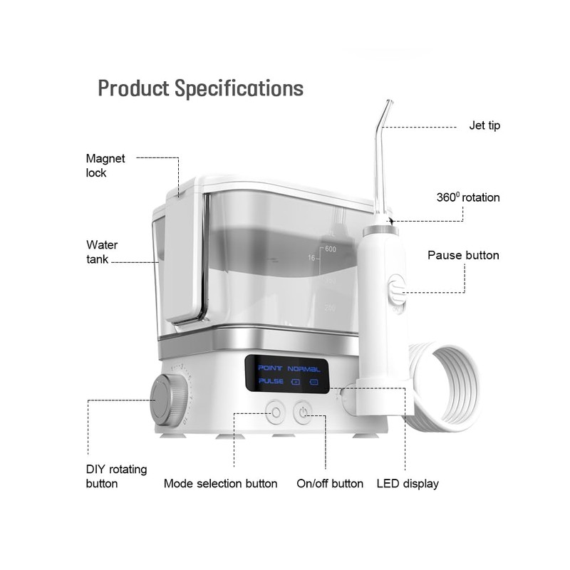 - 【600ML Large Water Reservoir & 360° Rotation Jet Nozzle】: The water dental flosser comes with an extra-large 600ml large water tank that lasts for 90 seconds. The nozzle can be stored in the lid of the water tank, which protects it from dust and dirt and makes it easy to access and use. The water flosser also provides a 360° rotation jet nozzle, making it easy to reach every crevice of your mouth. And the nozzles is easily removable and replaceable with the switch in the handle.