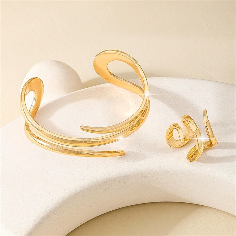 Gold Chunky Cuff Bracelet with Ring Jewelry Set for Women