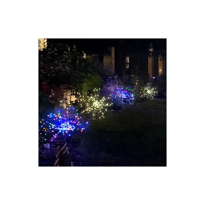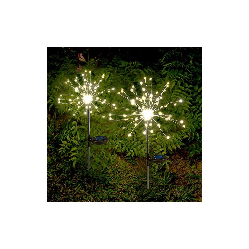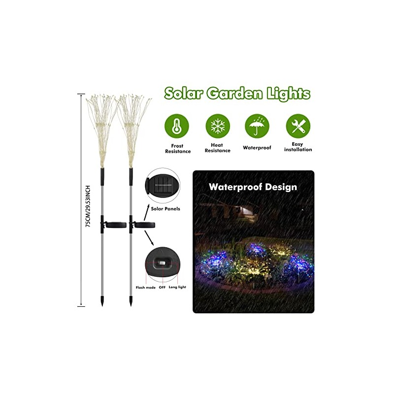 - 【 Waterproof Solar Lights can Withstand all Kinds Of Weather】 Solar garden lights firework are made of durable weatherproof and anti-rust materials . This firework lights can withstand extreme weather and Anti-rust, You can use them to anywhere you like ; Wireless setting up and built-in light sensor,turn on the switch, those solar lights will automatically turn on in the dark and turn off automatically during the day