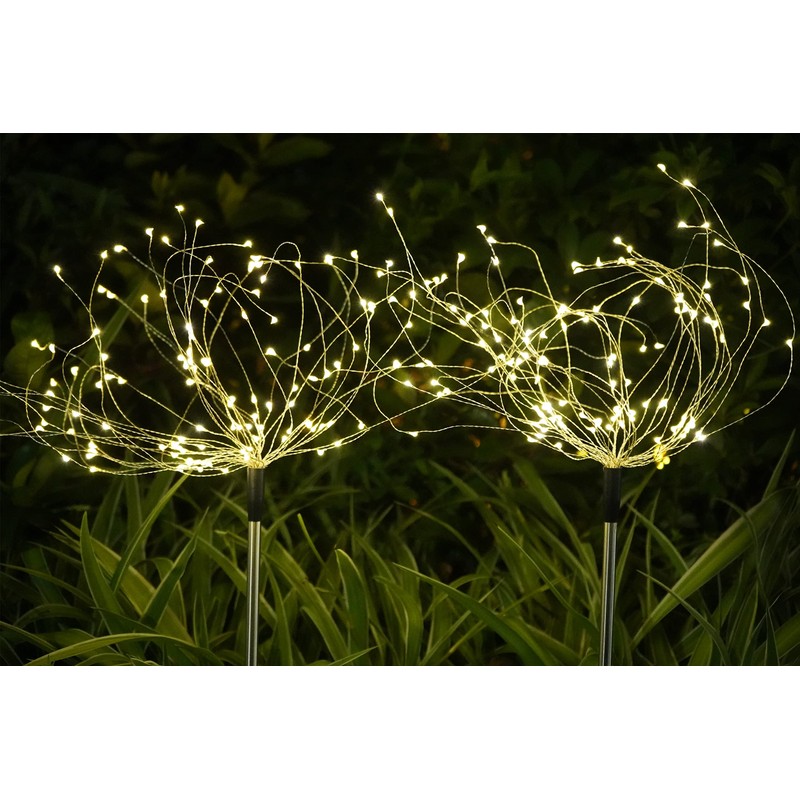 - 【Upgraded 120 LED Creative Solar Garden Lights】This solar firework light with the flexible copper wires , the 120LED upgraded high bright small LED beads are distributed on each line, you can twist the flexible copper wires to your favorite shapes such as flowers, fireworks, hearts, spirals, spheres,etc., If you choose warm white lights, when night falls, these lamp beads light up like masses of lightning bugs , arranged in the shape you design, decorate your yard, flower bed