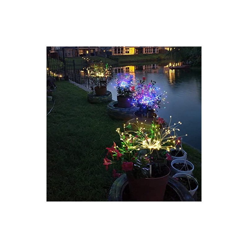- 【Continuous Longer Lighting Solar Outdoor Lights】This solar firework lights use upgraded solar panel and build-in high-capacity battery which means our solar outdoor lights can effectively collect more sunlight and store more electrical energy,charging for 4-6 hours under sunlight can continuous illuminate 8-10hrs,which greatly meets your needs for long lighting time