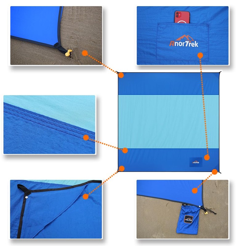 - [Minimalistic & chic] Our beach mat is made up of multiple colors, perfectly complementing the beach and sea, creating a simple yet stylish look. complemented by 4 ABS plastic stakes & 4 corner sand pockets, it ensures that the mat remains securely anchored, even on windy days. Below the AnorTrek logo, there is a built-in pocket on the mat to store personal stuffs. Practical and convenient.