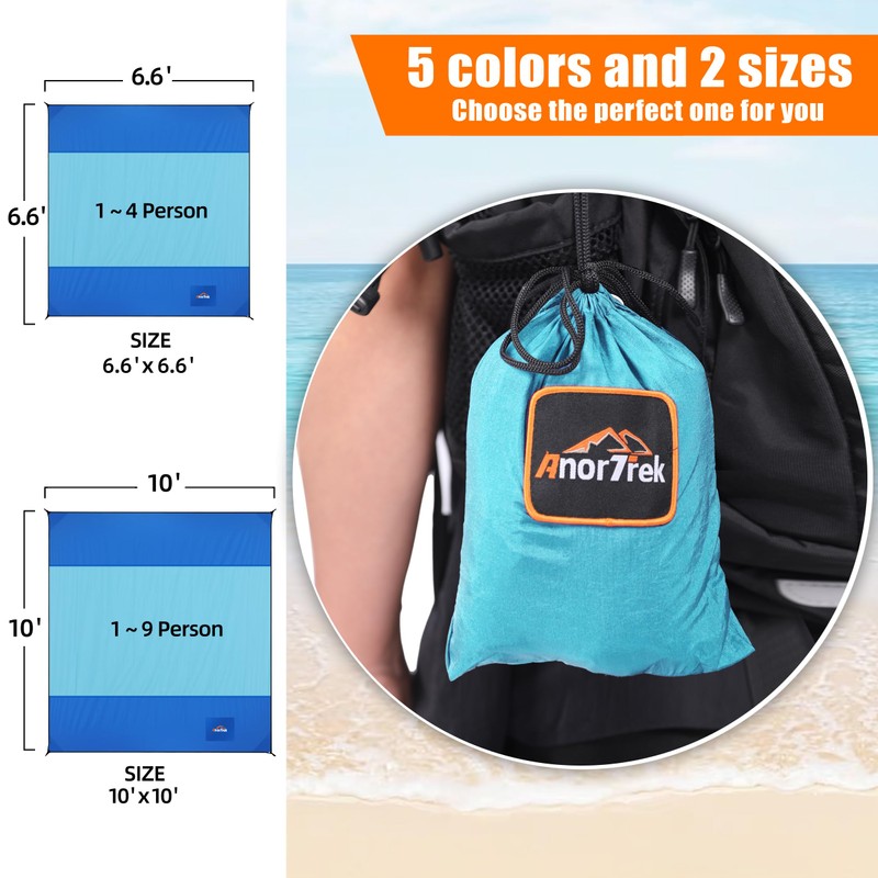 - [Extra Large size] Our beach mat is available in two size options, 6.6 x 6.6 ft (suitable for 1-4 person) and 10 x 10 ft (suitable for 1-9 person), offering flexibility to meet your needs. Whether you prefer a cozy gathering or a larger family outing, our mat provides ample space for relaxation and enjoyment.