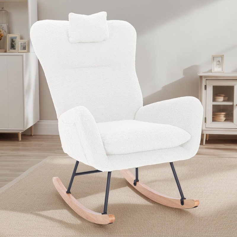 AnoYishev Rocking Chair Nursery with Headrest, Teddy Upholstered Glider Rocker with High Backrest & Side Pocket, Modern Rocking Chairs for Small Spaces, Living Room, Bedroom (White)