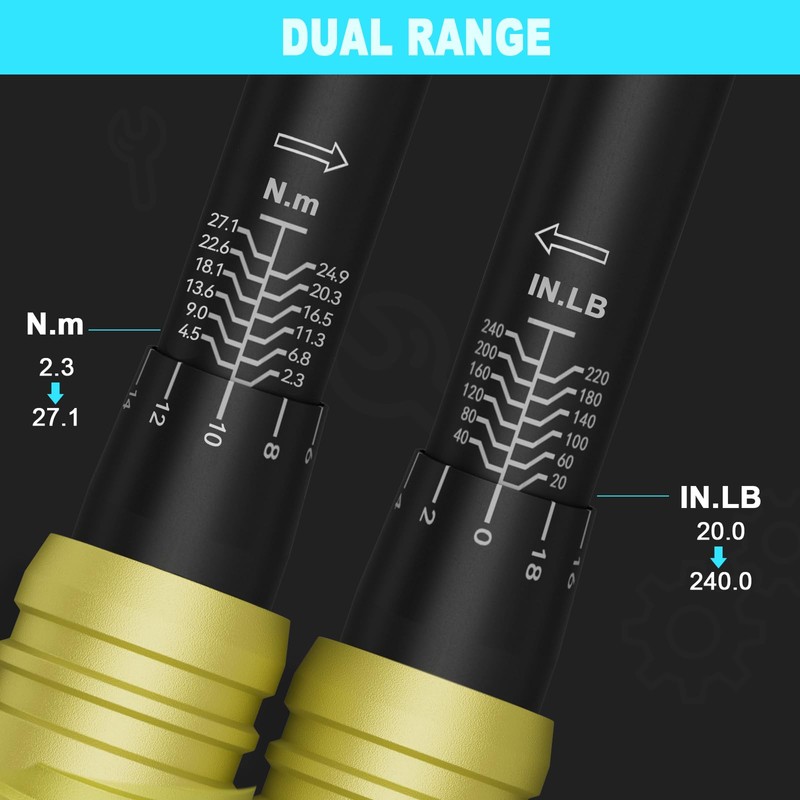 - 【High Accuracy】This 1/4 inch torque wrench features precise dual scales of 20-240 in.lb/2.3-27.1 Nm. The torque wrench body is made of lightweight aluminum material, more accurate than ordinary chrome vanadium steel. It tests for accuracy to industry standards within ±3%.