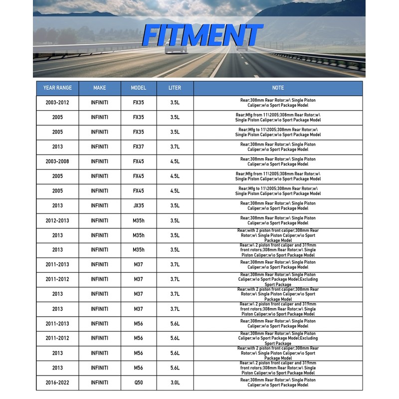 - [Vehicle Model Adaptation]: This Anpulsero brake pads and rotors kit is compatible with 2003-2007/2009-2022 Nissan Murano, 2013-2020 Nissan Pathfinder, 2004-2009/2011-2017 Nissan Quest, 2014-2020 INFINITI QX60, 2014-2022 INFINITI Q50, 2003-2012 INFINITI FX35, 2013 INFINITI JX35, 2011-2013 M37, 2014-2017 QX70, 2014-2019 Q70, 2017-2022 Q60, 2015-2019 Q70L, 2003-2008 FX45, 2013 FX37, 2011-2013 M56, 2012-2013 M35h [ Note: 308mm Rear Rotor with Single Piston Caliper without Sport Package Model ]