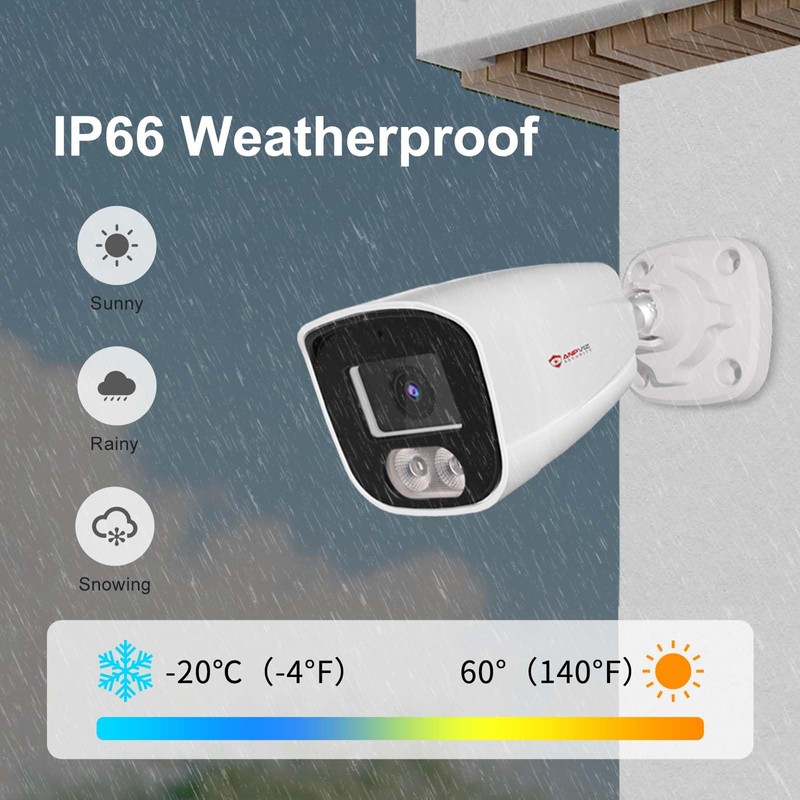 • IP66 waterproof and 2.8mm wide angle lens: all-metal housing ideal for outdoor applications. It is designed to withstand extreme temperatures and is protected from dust and rain. The fixed 2.8 mm lens of this 4MP PoE outdoor camera offers an impressive field of view of 108° to cover and protect a larger area.