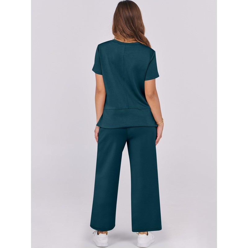 - Features - Women's two piece outfit, featuring a short sleeve top and high waist wide leg pant. Crewneck, Short Sleeve, Drawstring, Wide Leg. The women's tracksuits perfect for daily wear, travel, school, work.