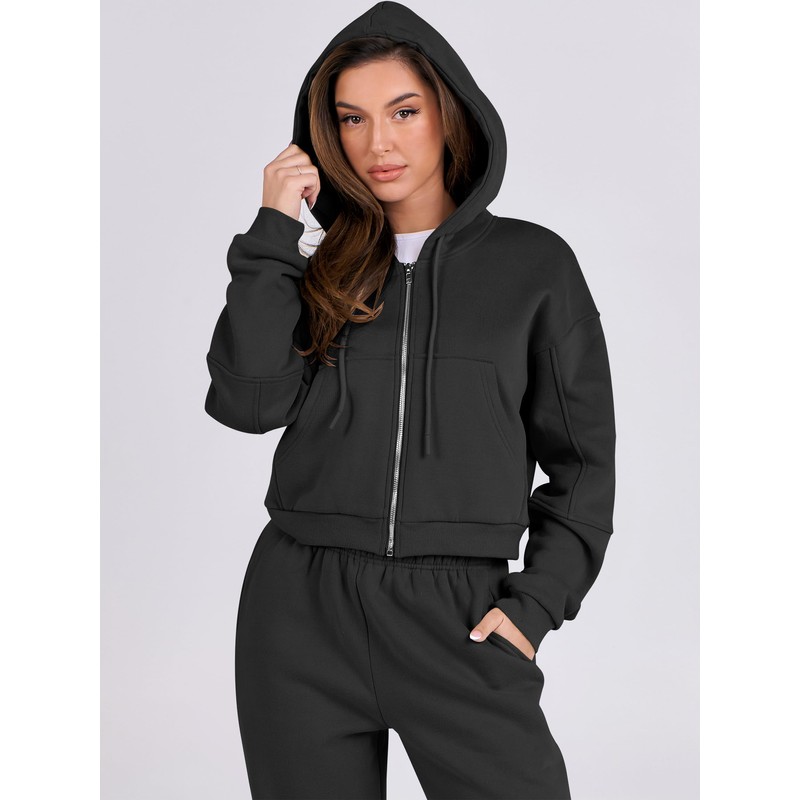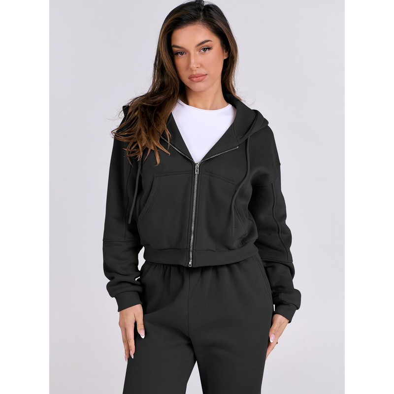 ANRABESS Women 2 Piece Outfits Sweatsuit Zip Up Crop Hoodies SweatPants Lounge Matching Sweat Set 2024 Winter Trendy Clothes Black Small