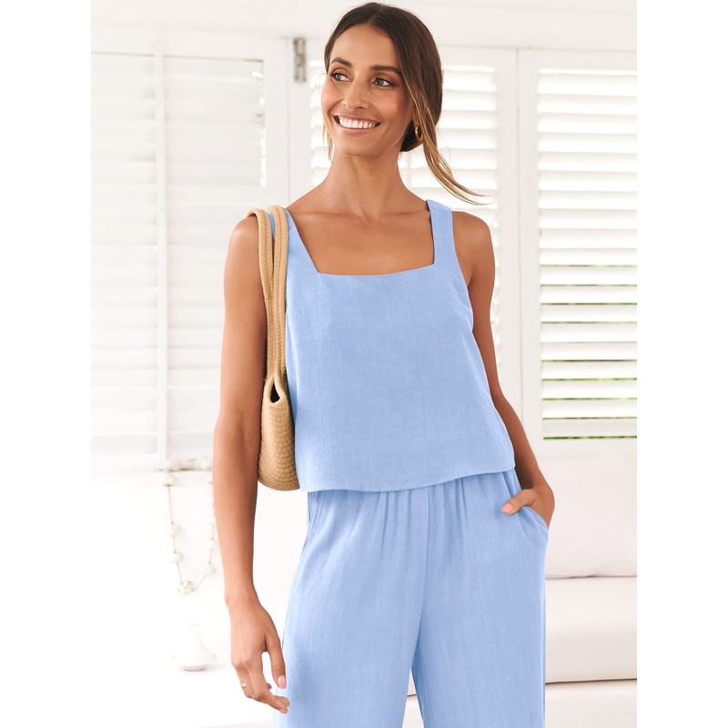 - Features - Summer Linen 2 piece outfit featuring a crop tank top, wide Leg Pants with two side pockets, sleeveless square neckline design, perfect for your beach, vacation,travel, casual wear