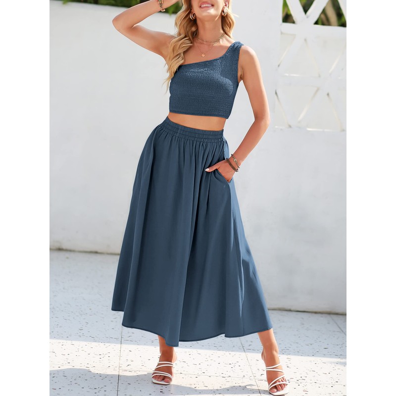 - Stylish Design - Flaunt your style in our smocked one-shoulder crop top and high elastic waist long skirt two-piece outfit that comes with pockets and ankle-length skirt.