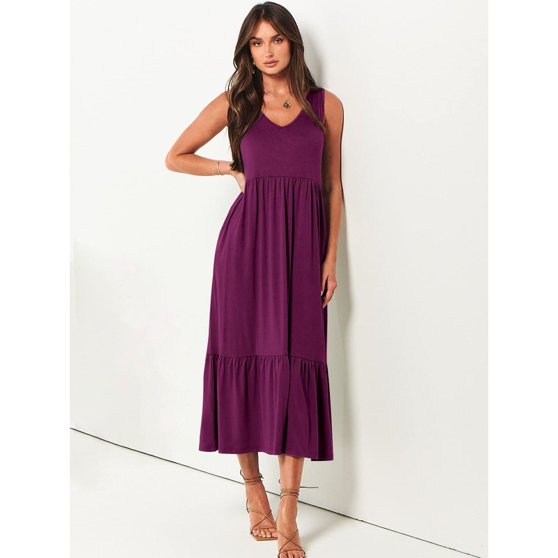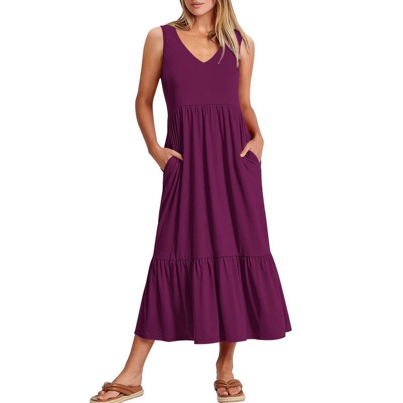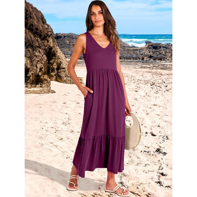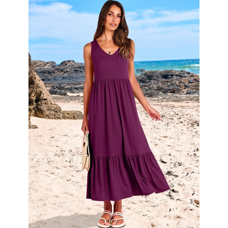 ANRABESS Womens Summer Maxi Dresses Fit & Flare Flowy V Neck Sleeveless Swing Casual Tiered Beach Sundress with Pockets Dark Purple Large
