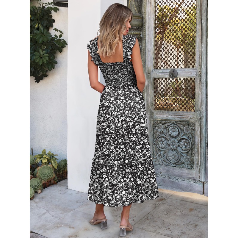 ANRABESS Womens Summer Sleeveless Maxi Dress Square Neck Smocked Boho Casual Ruffle Strap Flowy A-Line Long Beach Sundress Black Floral Medium