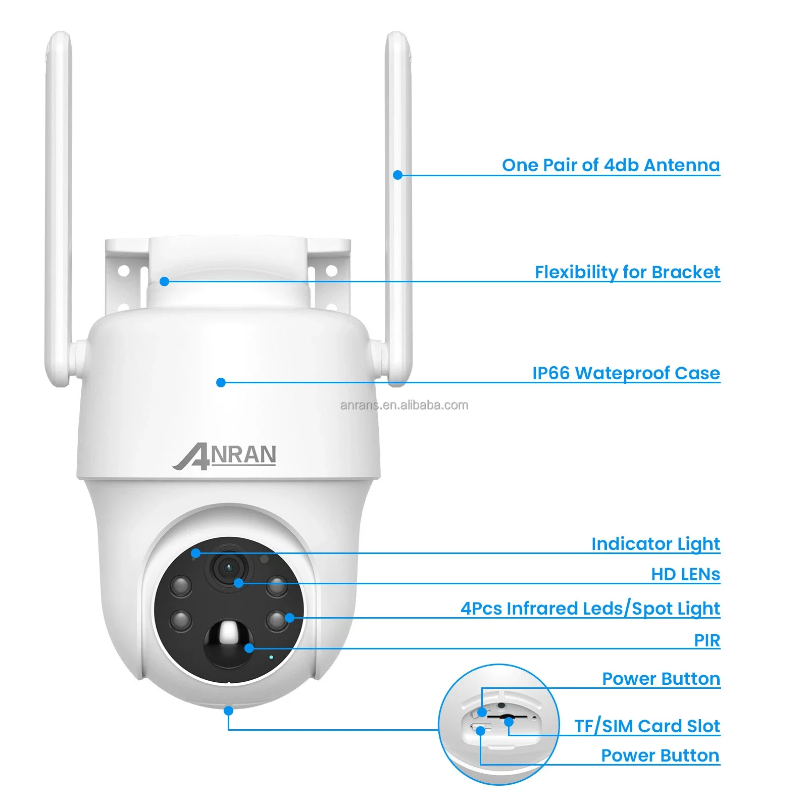 ANRAN 4G LTE Cellular Solar Security Camera Outdoor,Sim Card&SD Card,2K Night Vision,2 Way Talk,Motion Detection,IP65 WaterproofNetwork: 4g, Resolution: 2k
