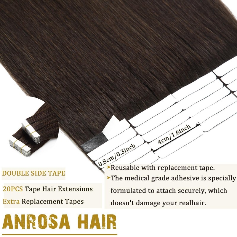 Anrosa Remy Human Hair Tape In Hair Extensions 20 Pieces Tape Hair Extensions Light Dark Brown 20 Inch Invisible Straight Human 50 Gram Seamless Skin Weft