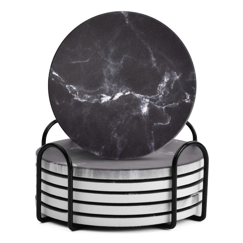 - COASTERS WITH METAL HOLDER SET This set includes 6 round ceramic coasters (marbled surface pattern, 4 inches in diameter, 0.3 inches thick) and a 4.5 inch black metal coaster (stain and scratch resistant, not easy to rust). When not in use, you can put it directly into the holder to keep your home tidy.