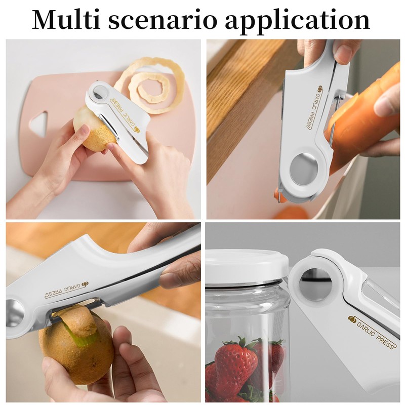 - High-quality materials: The multifunctional garlic press is made of food-grade ABS and stainless steel, which is safe, lightweight, sturdy, durable and will not rust. It can easily crush garlic, ginger, onions, and can also peel fruits and pry open cans.