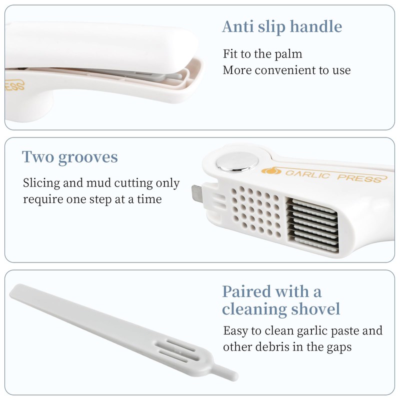 - Multifunction: The handheld garlic press can be cut and crushed garlic and ginger. It can chop garlic and slice it to suit your different needs. The garlic press is also designed with blades that can be used as a paring knife and can opener.