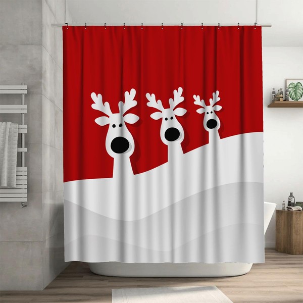 Ansouyi Christmas Reindeer on Red Shower Curtain Set with 12 Hooks, Bath Curtains Waterproof Polyester Fabric, Home Bathroom Bathtubs Decor Washable Durable Fabric, 72" Wx72 L