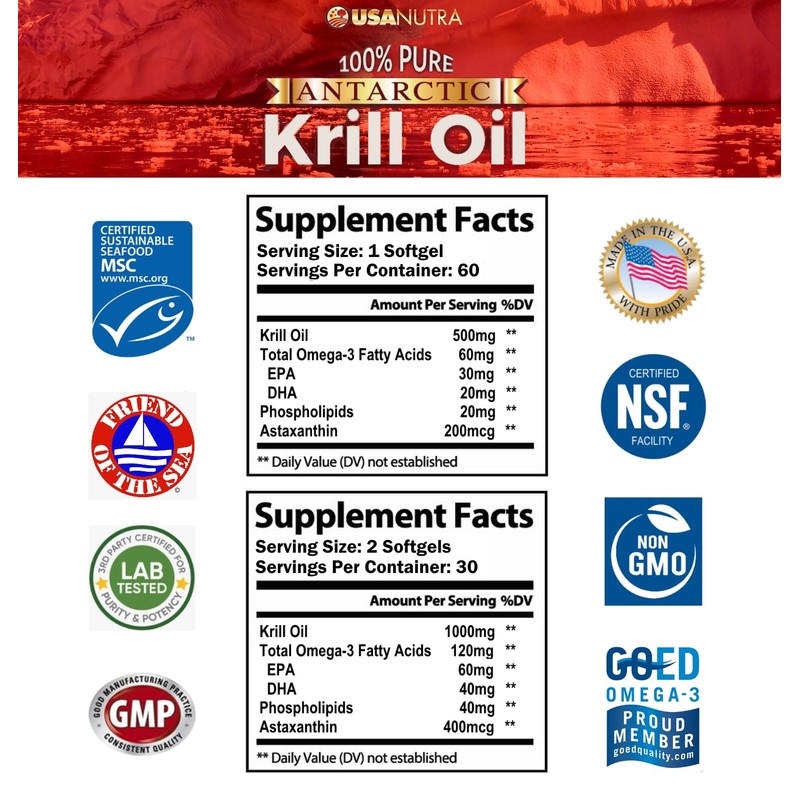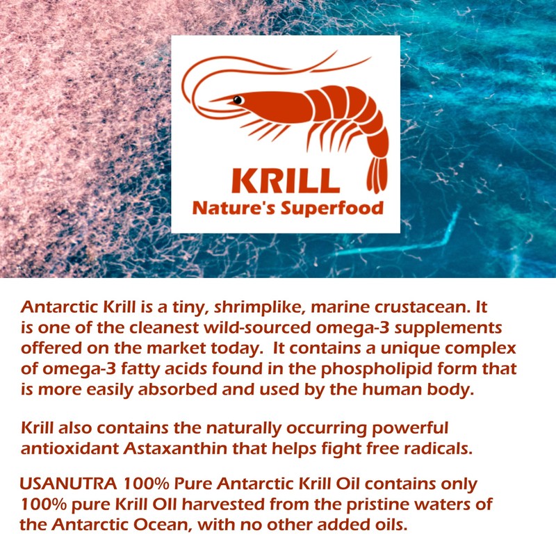 USANUTRA 100% Pure Antarctic Kill Oil is harvested from the pristine Southern Ocean surrounding Antarctica to provide you with a reliable daily source of the highest bioavailable phospholipid bound Omega-3 EPA and DHA fatty acids with Astaxanthin to support healthy eyes, brain, heart, joints, and skin. The water soluble phospholipid bound Omega-3s in USANUTRA Antarctic Krill Oil are absorbed much faster and 4X more effectively than the triglyceride-based Omega-3s in fish oil supplements. USANUTRA 100% Pure Antarctic Krill Oil has no other added ingredients. Beware of “blended” Krill oils that contain low cost added ingredients.