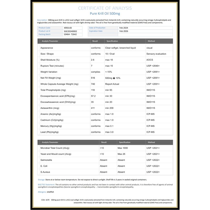 USANUTRA 100% Pure Antarctic Krill Oil is ultra purified to be free from PCBs, mercury, or other harmful contaminants. We stamp the date and lot number on every factory sealed bottle so you know the product you receive is fresh and passed strict quality control testing. Quality and purity are certified by independent third party laboratory testing.