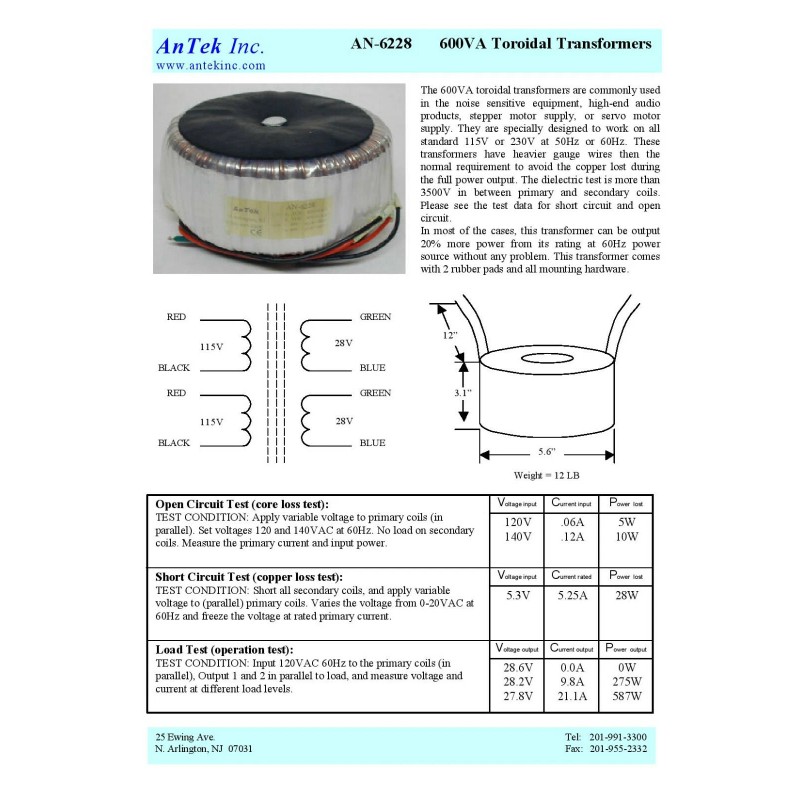 The 600VA toroidal transformers are commonly used in the noise sensitive equipment, high-end audio products, stepper motor supply, or servo motor supply. They are specially designed to work on all standard 115V or 230V at 50Hz or 60Hz. These transformers have heavier gauge wires then the normal requirement to avoid the copper lost during the full power output. The dielectric test is more than 3500V in between primary and secondary coils. Please see the test data for short circuit and open circuit. In most of the cases, this transformer can be output 20% more power from its rating at 60Hz power source without any problem. This transformer comes with 2 rubber pads and all mounting hardware.
