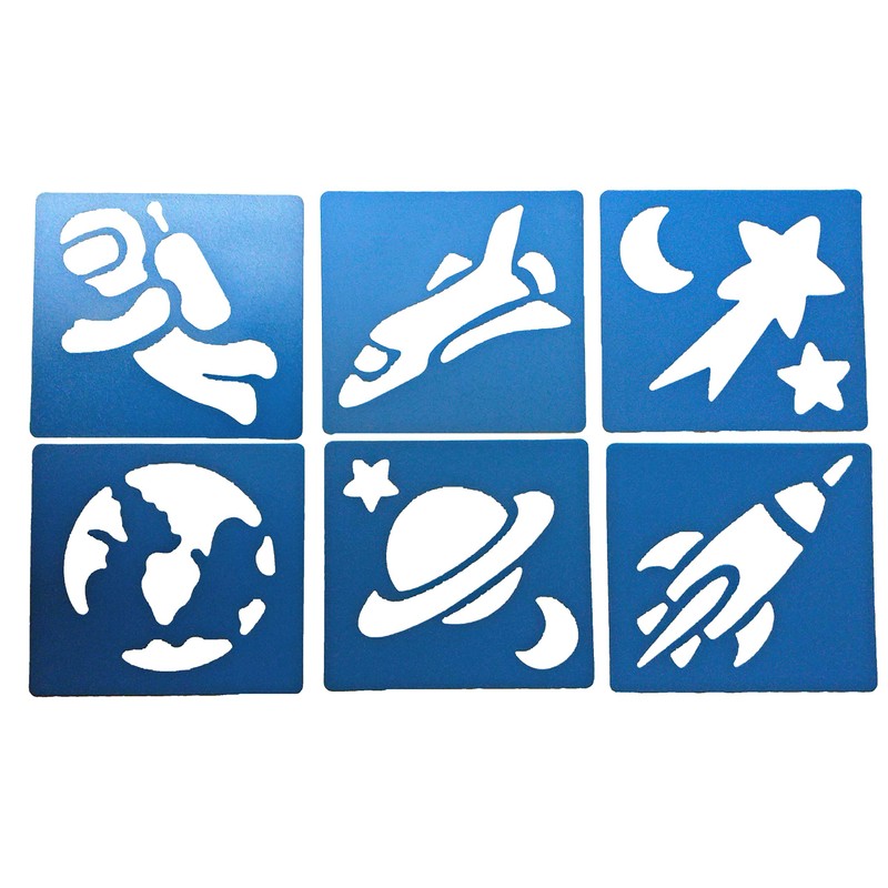 - INCLUDES 6 SPACE THEMED PLASTIC ART STENCIL TEMPLATES: Each pack includes six stencils including a planet, plane, stars & moon, astronaut, earth, rocket.