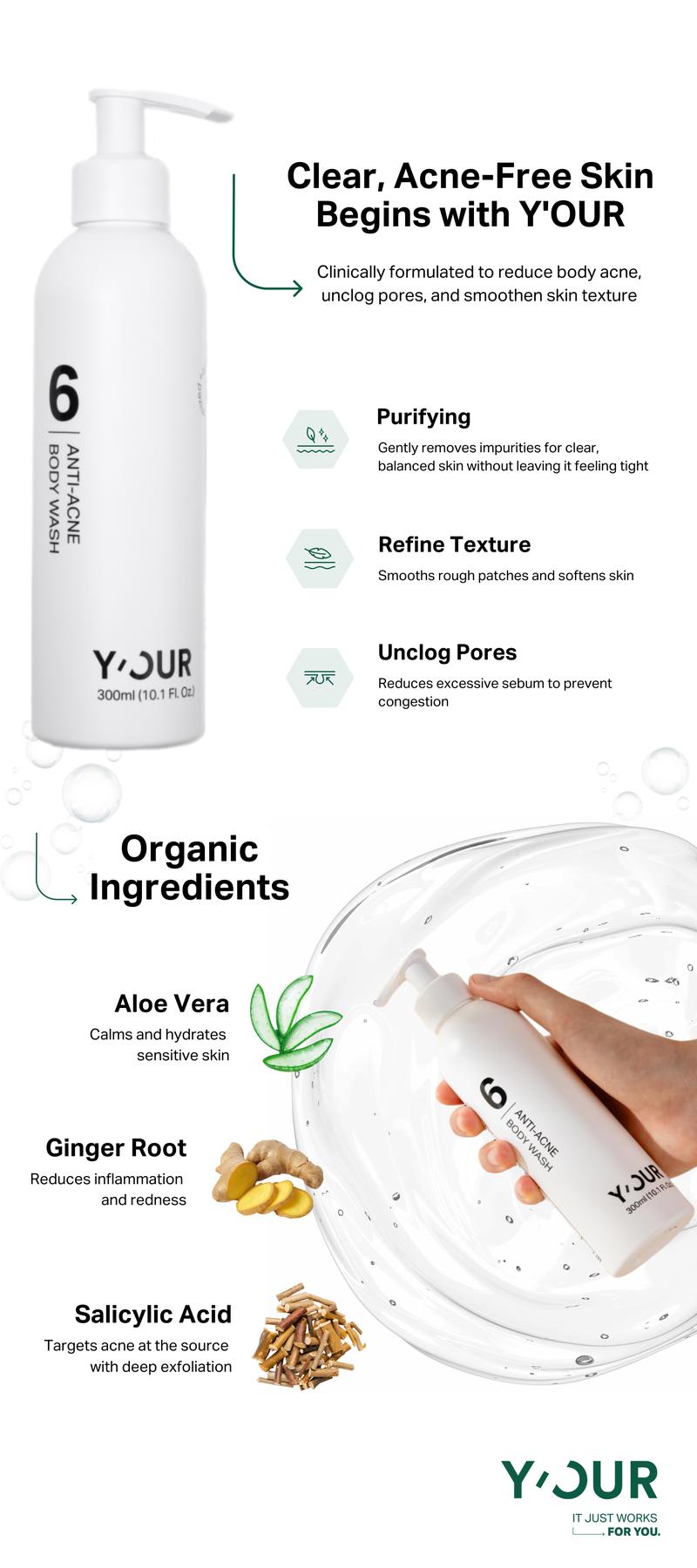 Anti-acne Body Wash by Y'OUR | Body, Back, Chest Acne | Exfoliating and Hydrating | Salicylic Acid, Aloe Vera, Ginger Root | Body Care & Comfort