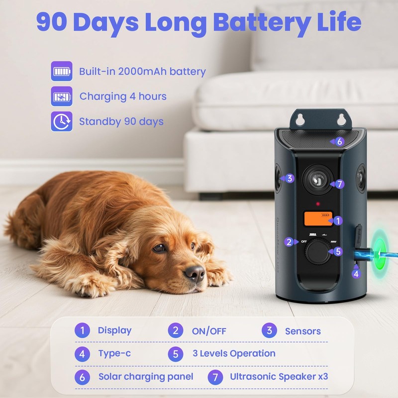 - 🐶Solar Charging &Type-C Charging Renewal: The only anti-barking device on the market with solar renewal charging, when you use it in the garden or outdoors, use this anti-barking device outdoors when the device is fully charged for 4 hours, with a range of 30 days, it can also absorb solar energy to supply power for its own energy storage, with the energy storage converted at around 21%, it is a suitable anti-barking device for outdoor use and outdoor charging on its own. Bark Stopper.