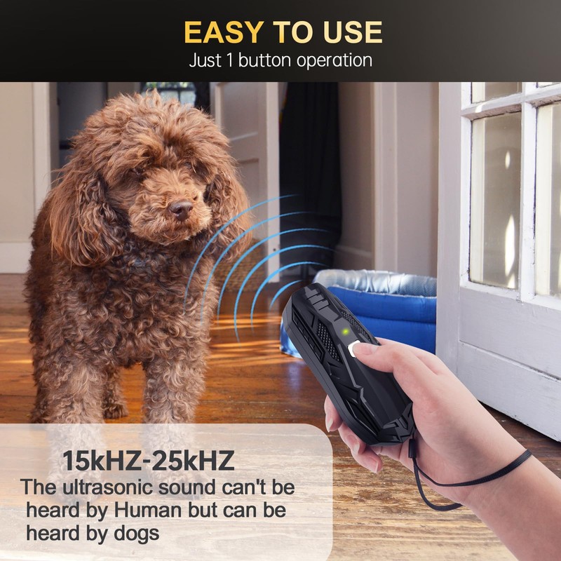 - 🐕【1 Button Control】: The stop dog barking device is easy to use, you just need to press & hold the button, it will emit ultrasonic to attract the dog’s attention and make them stop barking or bad behaviors.