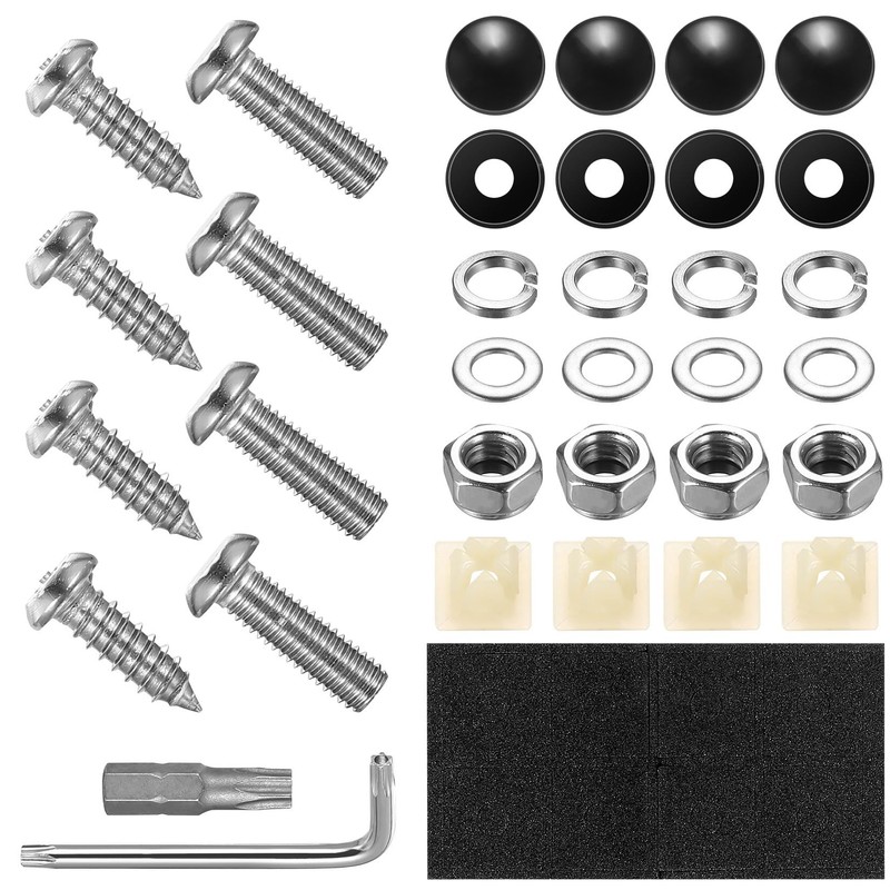 2. Enthält 4 Stück kennzeichenschrauben, 4 Stück selbstschneidende Schrauben, 8 Stück EVA-Schaumscheiben, 8 Paar schwarze Schraubkappen, 4 Stück Muttern, 4 Stück Unterlegscheiben und 4 Stück Federscheiben, 4 Stück Clips sowie einen Sicherheitsschlüssel und einen Schraubendreherbit – alles, was Sie für eine einfache und problemlose Montage benötigen.