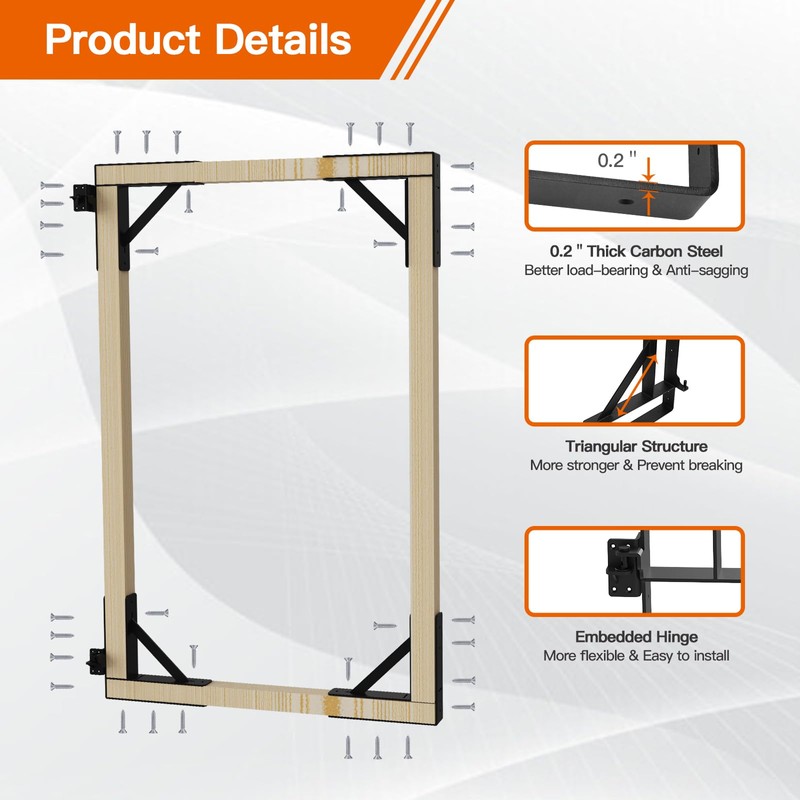 - Anti Sag Design: It uses 0.2-inch thick steel and a stable and reliable 90-degree triangular structural bracket design to enhance stability and effectively prevent the door from sagging or deformation. It can better repair sagging old wooden doors or provide stable support for new doors to prevent them from sagging for a long time