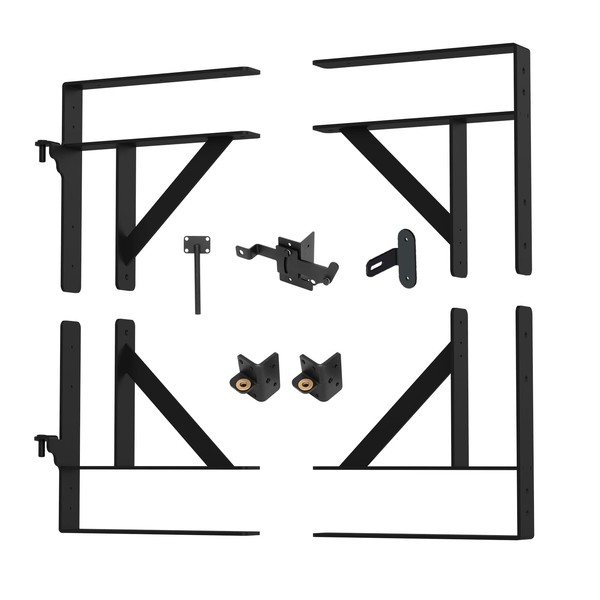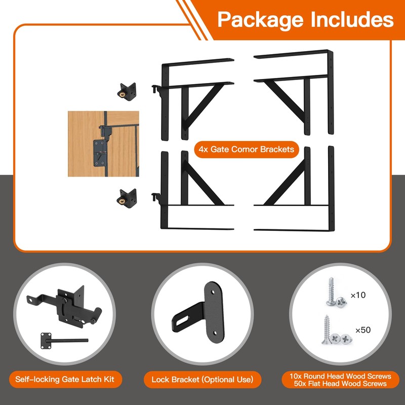 - Package Includes: 4 heavy-duty brackets (2 with hinges), 1 latch kit, 10 round-head wood screws (for mounting the latch kit), 50 flat-head wood screws (for assembling the brackets)