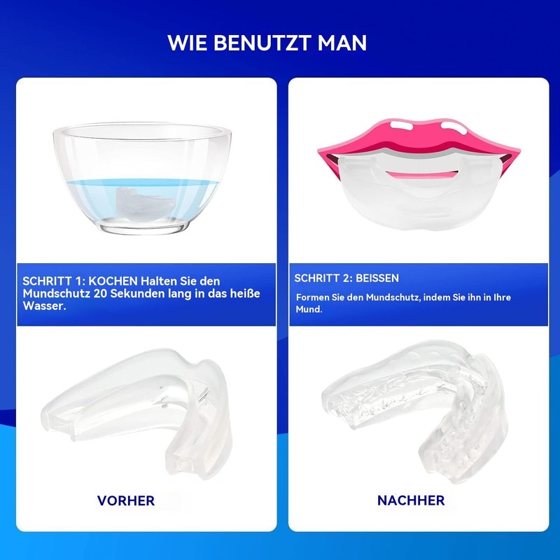 - Einfach zu verwenden und zu formen: Dieses Schnarch-Mundstück kann durch einen einfachen thermischen Anpassungsprozess an die Form Ihrer Zähne angepasst werden. Kochen Sie es 13–20 Sekunden lang in heißem Wasser und stecken Sie es dann in den Mund, um eine angenehme Form zu bilden.