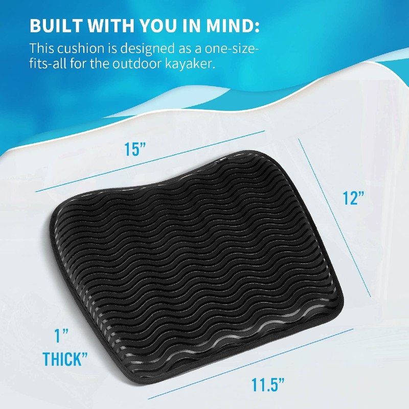 - Thick, But Not Too Thick: Don’t lose your center of gravity with a kayak cushion that’s too thick. Our 1.02 inches cushion is designed to give you support without causing you to feel out of balance. Kayak Seat Pad measures 15” x 12.4” x 1”.