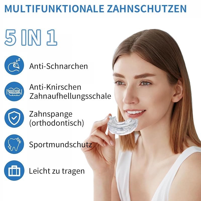 - 5-in-1 multifunctional: our mouth guards not only prevent snoring and provide you with a peaceful night's sleep. You can also reduce the noise and toothache caused by teeth grinding. They can also be used as a sports mouth guard to protect your teeth when practising high-performance sports. Also suitable as a teeth whitening splint.