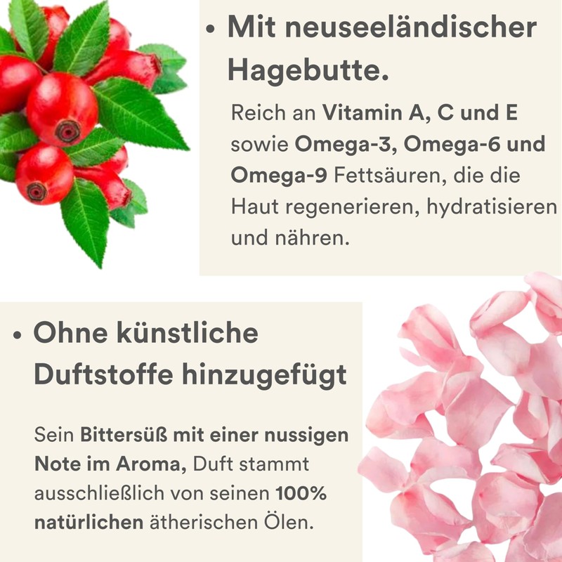 - - Contains organic rosehip oil, which is cold pressed to preserve its valuable nutrients and intensively nourish the skin.