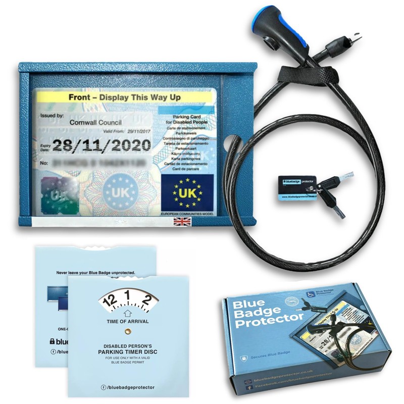 - Secure your blue badge with our anti theft disabled badge holder. Contents include a powder coated anti theft metal protector sleeve, acrylic cover, anti coil cable lock with x2 keys and timer clock.