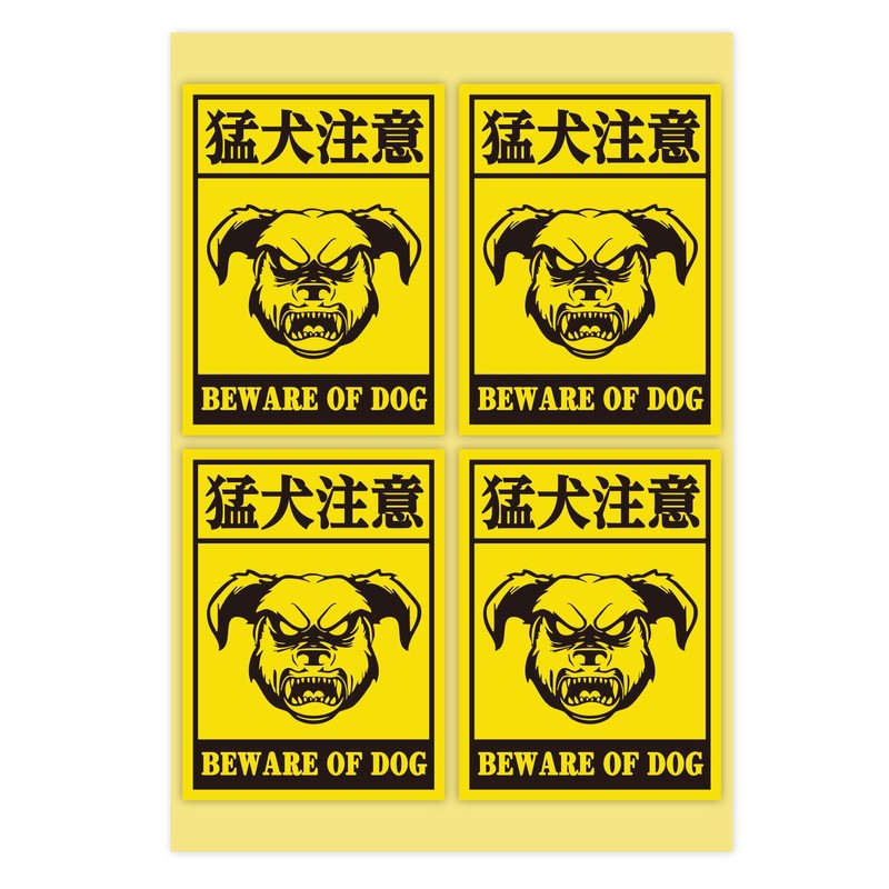 - Design: The text is written with the text "Beware of Dog" and the English translation of "BEWARE of DOG". Features a color scheme based on warning color scheme and illustrations of the fierce dog