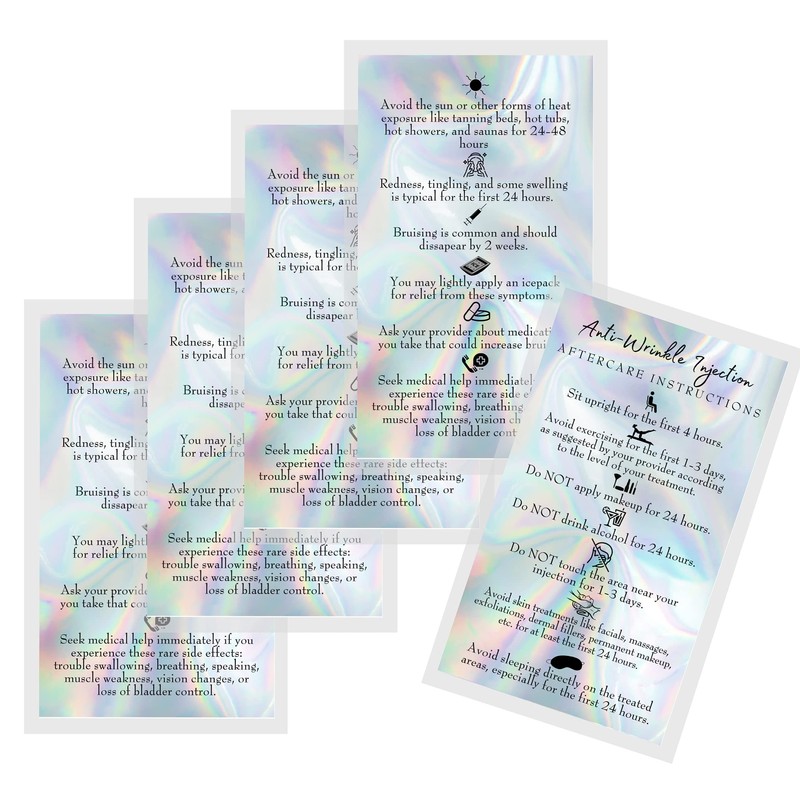 Anti-Wrinkle Injection Aftercare Card | 50 Pack | Physical Printed 2x3.5” inches Business Card Size | Non-Reflective Matte Holographic Look Design