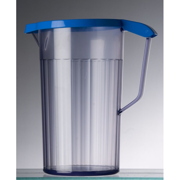 - Antibacterial, virtually unbreakable clear jug with blue lid.