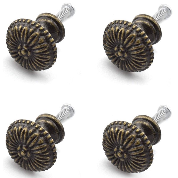 Antique Jewelry Box Pull Handle, OZXNO 4-Pack Retro Bronze Round Flower Pattern Pull Knobs & Mounting Screws for Cabinet Drawer Cupboard Wardrobe (0.9 x 0.9 inch)