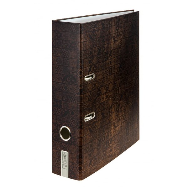This ring binder is printed with a design reminiscent of a flat mosaic picture from antiquity. Each individual mosaic stone is printed with subtle patterns, ornaments or flowers that repeat. This creates a large image or almost a small work of art due to the large number of small squares. The ornaments are reminiscent of wall paintings from times gone by. Thanks to the different colour gradations from light brown to medium brown to a very dark brown tone, the motif fits into any office decor and on any desk.
