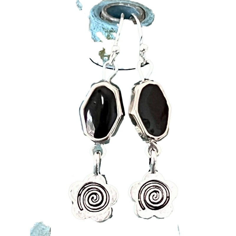 Antique Silver Flower and Black Dangle Earrings. Jewelry Earrings for Women #3298FE606