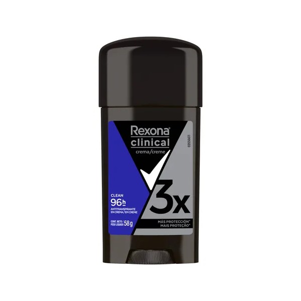 Descripción Limpia: Mantente en movimiento y no dejes que el sudor ni el mal olor te detengan. Con el Antitranspirante en Crema Rexona Clinical Clean tienes 3 veces más protección que con un antitranspirante común. El mejor desodorante para hombre es el que genera máxima protección contra el mal olor y el sudor excesivo. La exclusiva tecnología de este antitranspirante en crema forma un microescudo de protección contra el sudor que dura por 96 horas, ofreciendo al mismo tiempo control del mal olor gracias a su fragancia encapsulada.