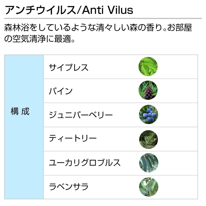 - Composition: Cypress, Pine, Juniper Berry, Tea Tree, Eucalyptus Globble, Lavender Sara